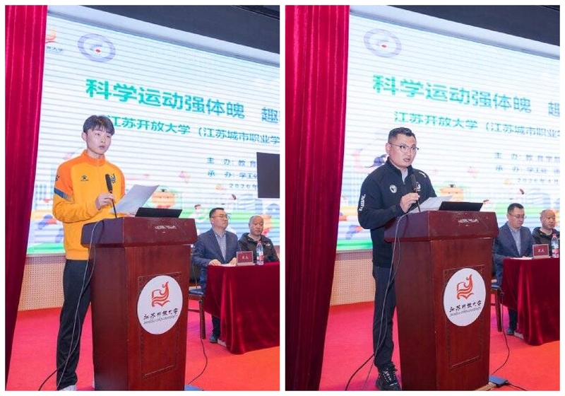 学生代表信工院成亿同学发言,号召同学们走出宿舍、走向操场,在运动中收获健康与成长。裁判员代表、教育学院体育部副主任赵建华承诺,公正执裁、热情服务,保障赛事公平有序。