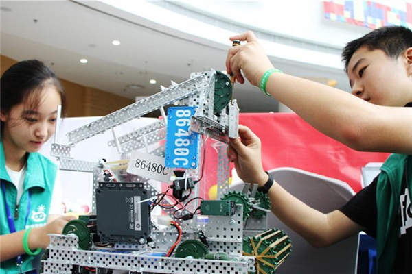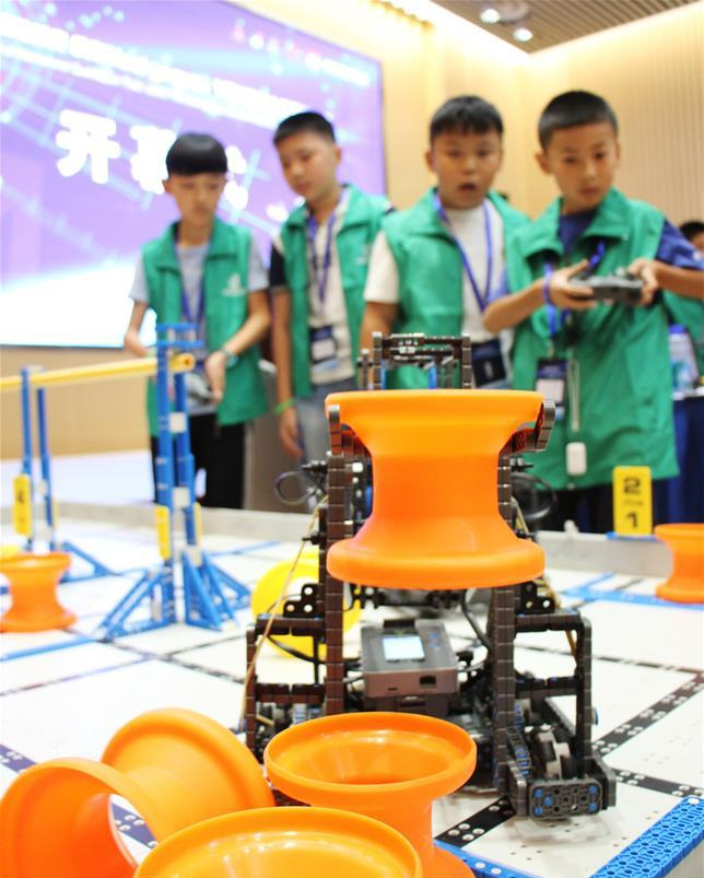 8月25日,学生在VEX机器人工程挑战赛现场参加比赛。新华社发(朱桂根 摄)